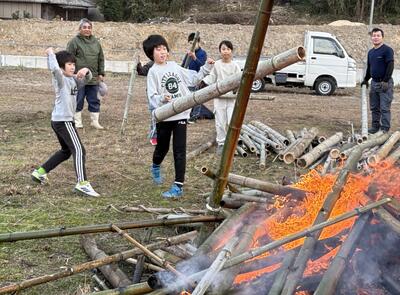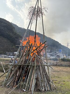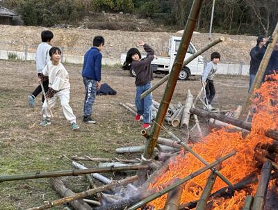 1月10日(土)に子々川地区の鬼火焚きが、子々川グラウンドで行われました。無病息災を願い、持ち寄ったしめ縄や門松などを燃やします。北小の門松や職員のしめ縄なども持参して焚かせてもらいました。