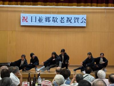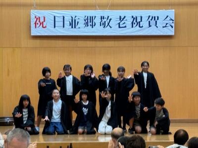 9月15日(日)敬老の日に北部コミュニティーセンターにおいて、日並地区の敬老祝賀会がありました。その中の出し物の一つとして、北小5,6年生有志による「ソーラン節」を披露しました。会場の皆さんも手拍子をしてくださり、温かい雰囲気の中、子供たちは気持ちよく踊れたようです。事前の学校での練習では、緊張して少しもじもじした様子でしたが、本番後は、「楽しかった。」「気持ちよかった。」といった充実感と達成感を味わえたようです。