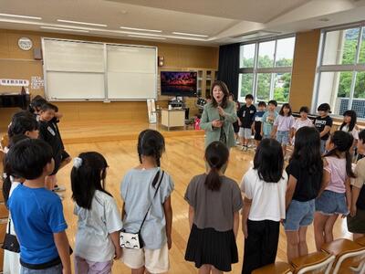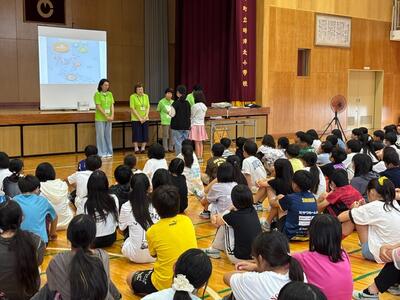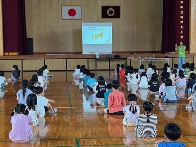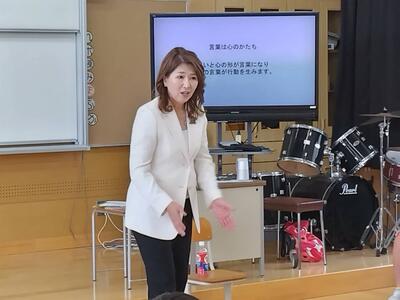 3日間にわたって、社員教育接遇マナー研究所代表の俵純子先生をお招きし、全校児童(全学級)を対象にマナー講座を実施しました。講座では、「明るい挨拶」「さわやか笑顔」「元気なハイ!」「きびきび行動」という4つの日常行動を軸に、軽快なテンポで先生のお話が進みました。