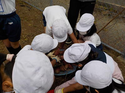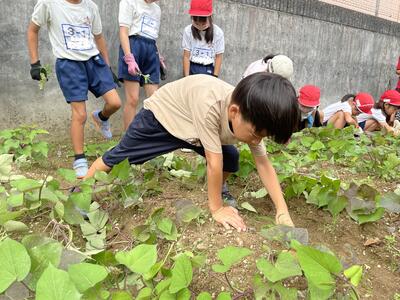 「すごい!大きい!!」「顔くらいの大きさだ!」など、予想していたよりも大きなさつまいもに大きな歓声が上がりました。「まだ土の中に残っていないかな。」と最後まで必死にいもほりへ取り組んでいる子どももいました。6月に植えた苗の成長を思い返しながら、収穫の喜びを感じることができたのではないでしょうか。