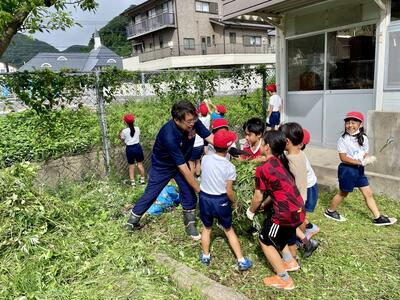 当日は朝早くから、交友会の方たちの手で草刈作業をしていただきました。子どもたちも、積み上がった雑草の山を見て「僕たちもできることをしよう!」と、さつまいも畑周辺の環境整備作業を行いました。